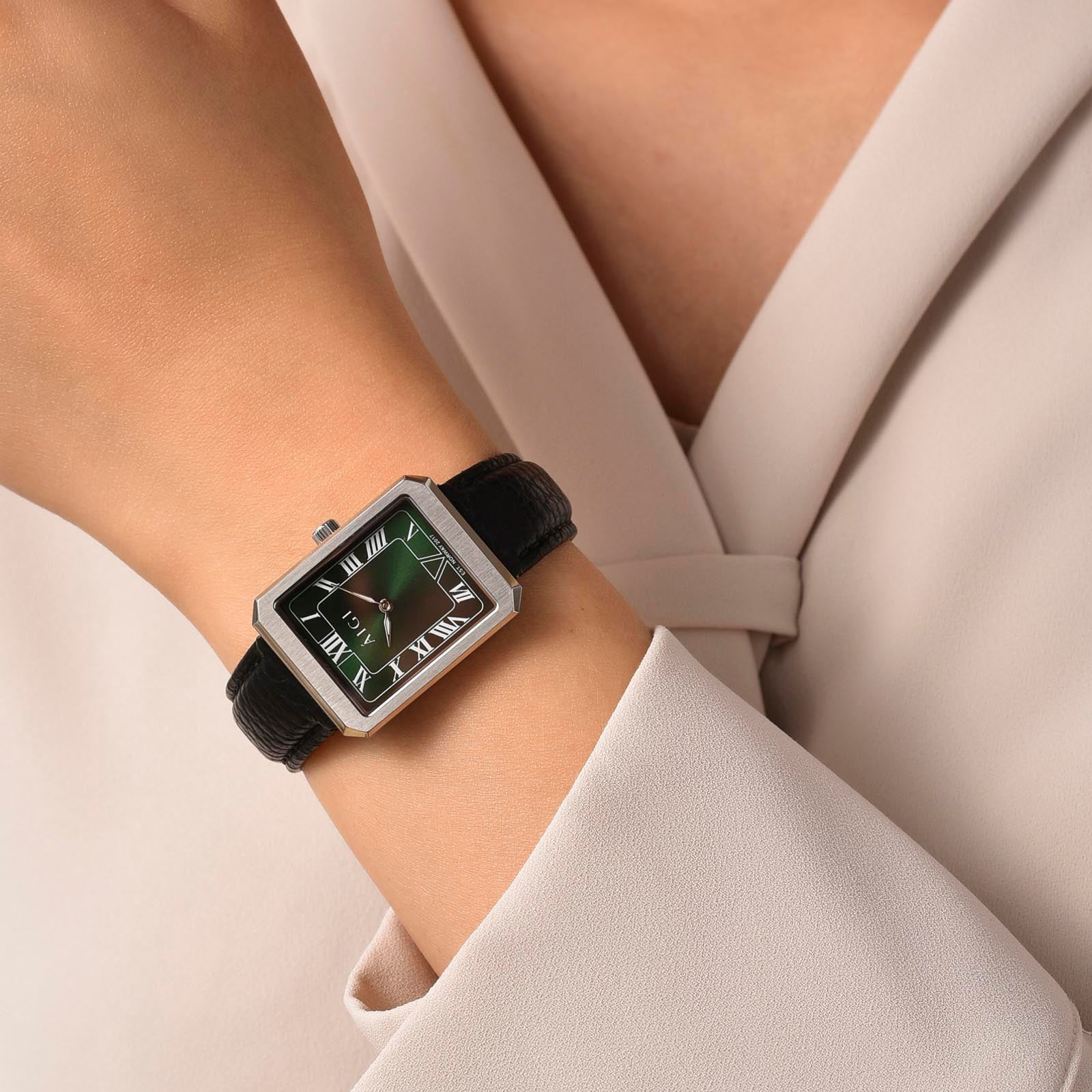 Rektangulær Nordlys - for første gang har vi innkapslet vår ikoniske nordlys-urskive i en sølvfarget dameklokke.