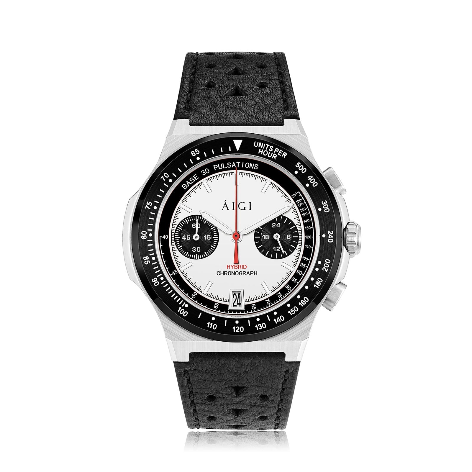 Møt Arctic Chrono II, oppfølgeren til vår mest populære kronografklokke. Hjertet i klokken er et hybridurverk fra Seiko (VK64), det vil si at kronografen er mekanisk mens selve tidsvisningen er kvarts. Reimen er laget av skinn fra Horween Leather Co. i Chicago, de har garvet og produsert skinn av høy kvalitet i over 100 år. Reimen har racinginspirerte hull kombinert med vår signaturtrekant, noe som gir den en litt mer original touch. Timesmarkørene og viserne er prydet med Super-Luminova fra Sveits.