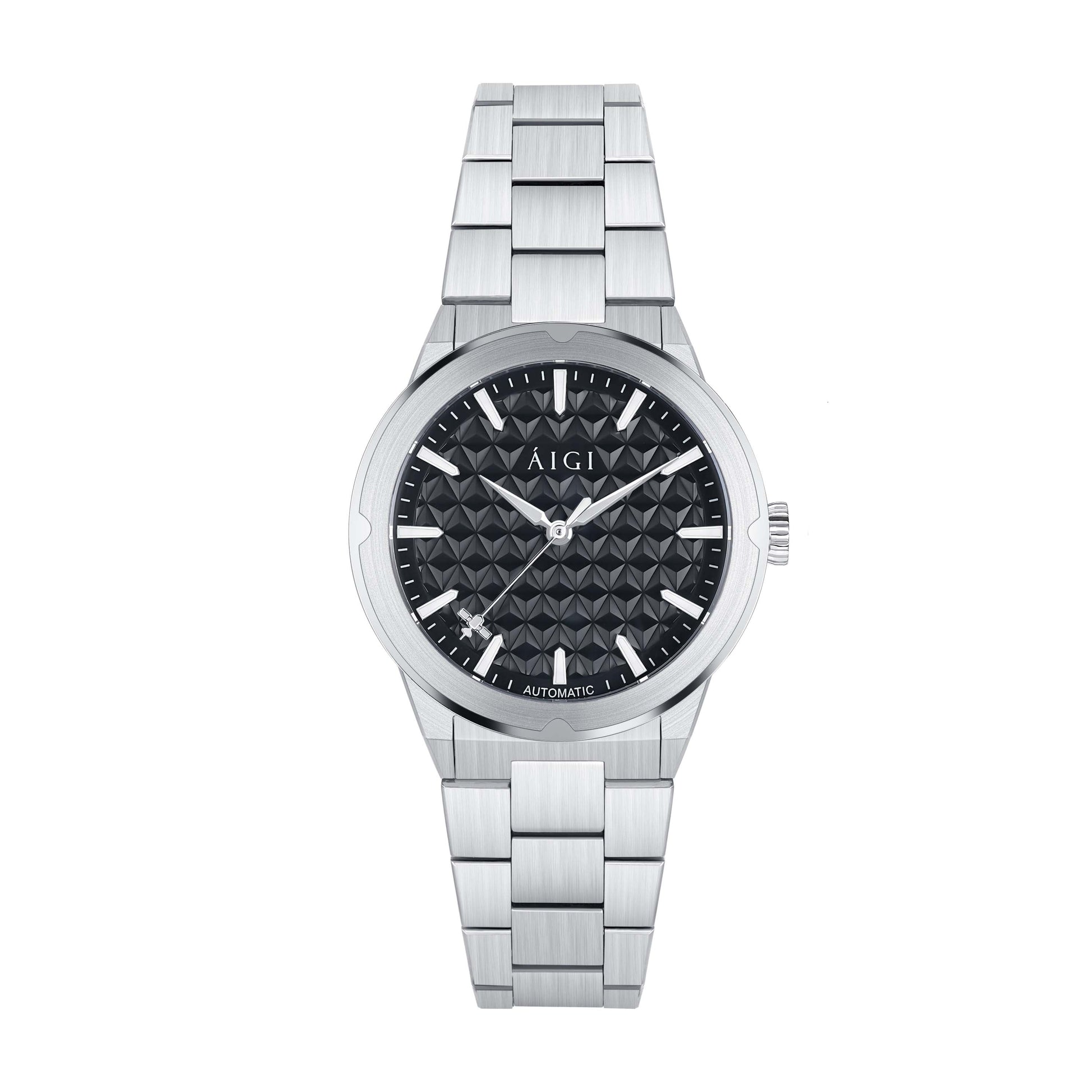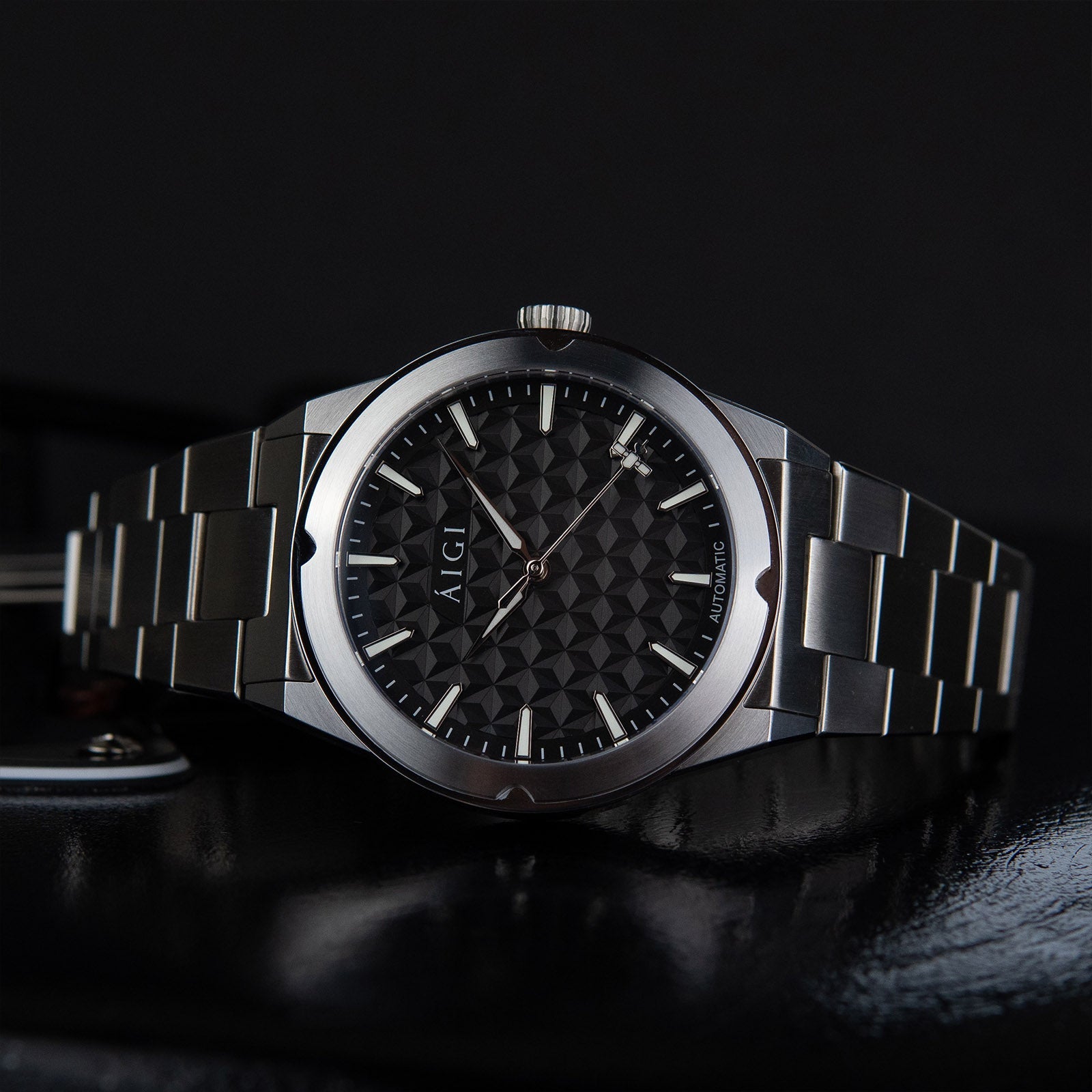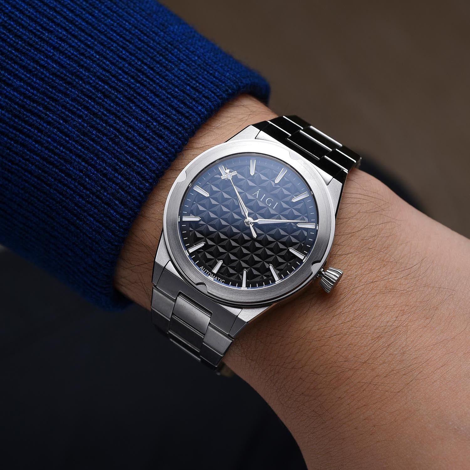 Den slanke urkassen, laget av kjemisk herdet rustfritt stål, gir en eksepsjonell ripebestandighet sammenlignet med normalt 316L rustfritt stål. Urskiven er inspirert av det globale nettverket av satellitt-bakkestasjoner, med et unikt radomemønster som etterligner de beskyttende kapslene rundt satellittantenner. Sekundviseren, som har en satellitt på tuppen, sveiper jevnt over den satellittinspirerte urskiven takket være det automatiske Miyota 9039 urverket med 8 slag i sekundet. Kronen på klokken er formet som en antenne med en intrikat konkav form på innsiden, noe som legger til en ekstra dimensjon av design og teknologisk inspirasjon.
