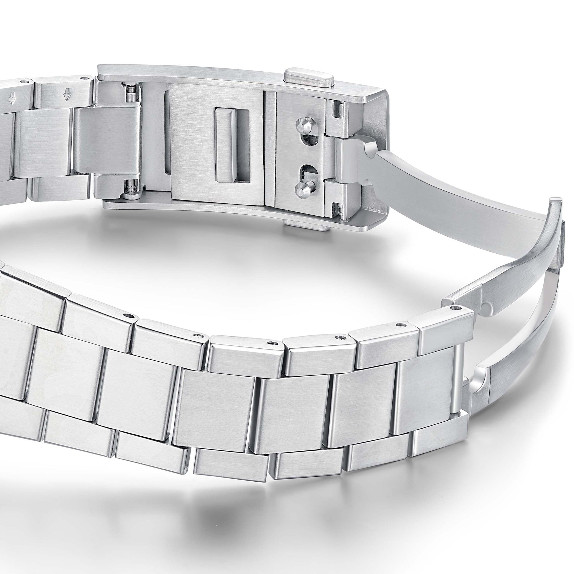 Med et hurtigutløsningssystem for reimen og verktøyfri mikroadjustering av lengden på lenken, tilpasser klokken seg lett til enhver anledning.
